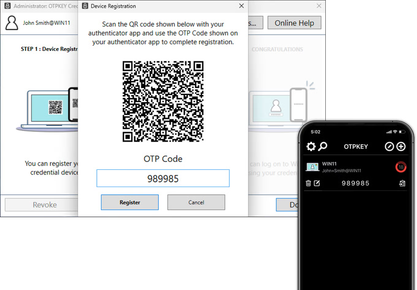 b) If the scan is successful, enter the displayed OTP code into the 'OTP Code' field on the PC screen's 'Device Registration' dialog. Then, click the 'Register' button to complete the registration processed.