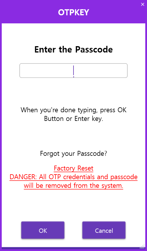 1. If the OTPKEY is protected by a passcode, the following window will appear: