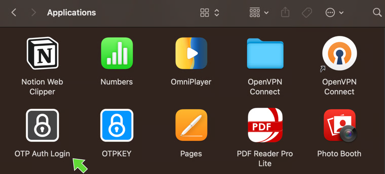 After installation is complete, you can find the following "OTP Auth Login" app in your Applications. You can use this app to register and manage OTP credentials on your Mac.