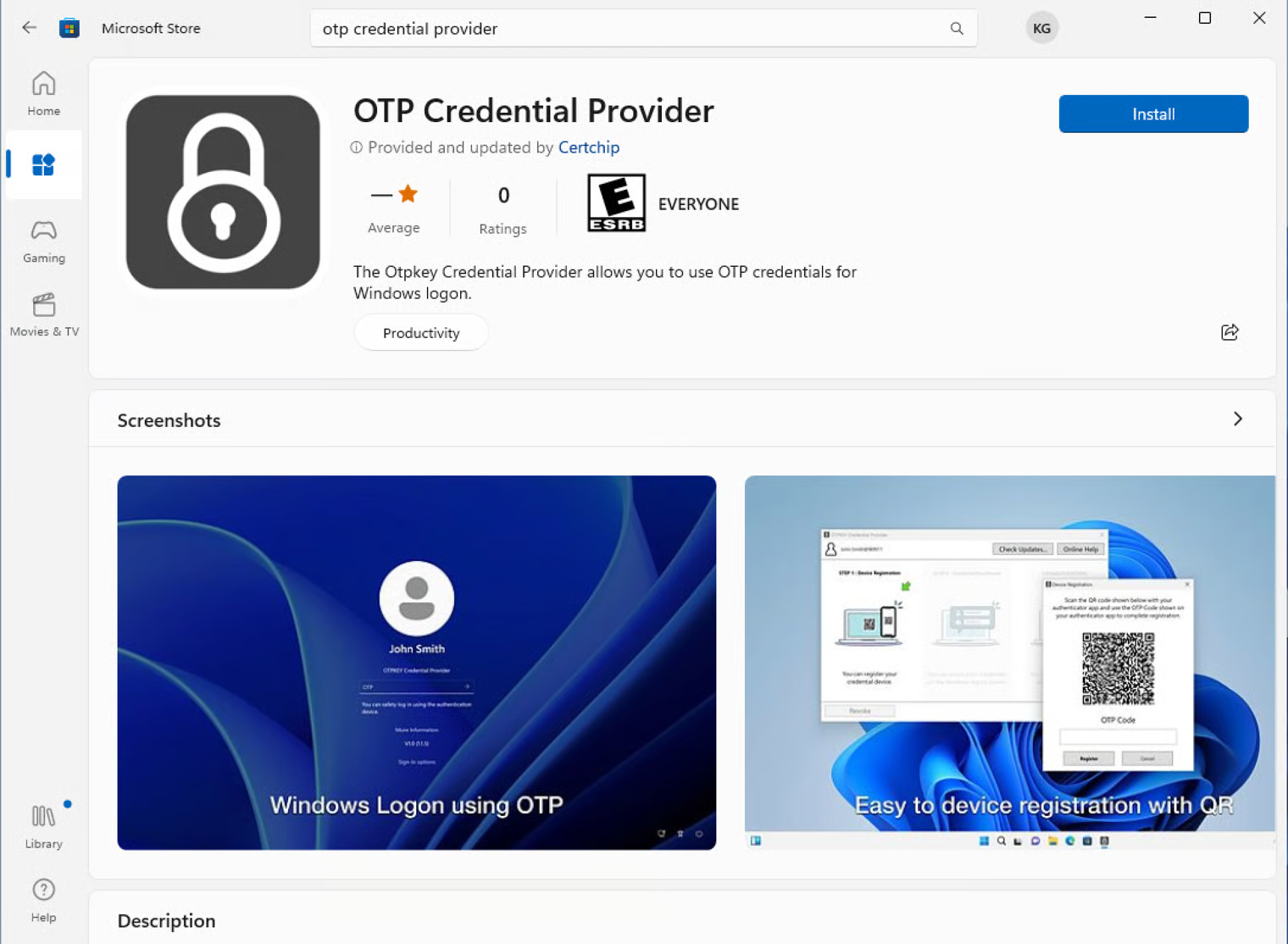 You can find the "OTP Credential Provider" app in the Microsoft Store as follows and you can safely and easily install it on your Windows system.